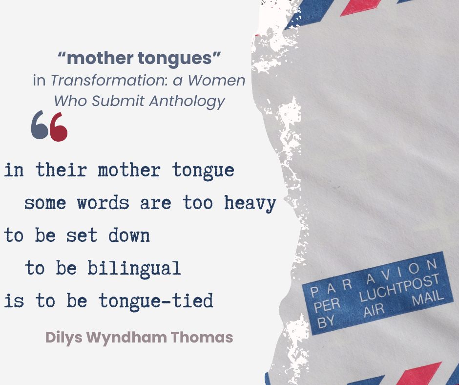 I’m a member of Women Who Submit: “mother tongue”, my first bilingual prose poem features in their latest anthology, Transformation (Jamii Press).