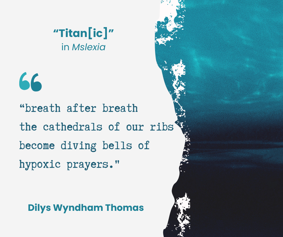My golden shovel, “Titan[ic),” appears in issue 107 of Mslexia, as part of their Blue-themed showcase, curated by Amy Kay. I wrote this poem as an elegy to the victims of the Titanic and Titan.
